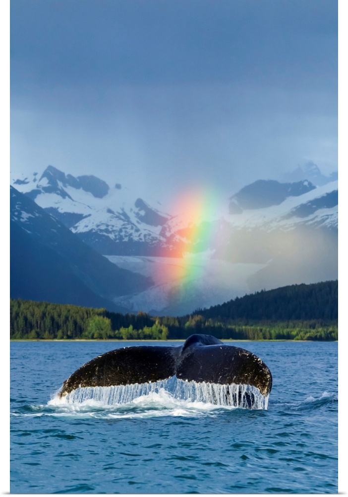 <p>Bright Rainbow Over Eagle Beach With A Fluking Humpback Whale, Alaska</p>