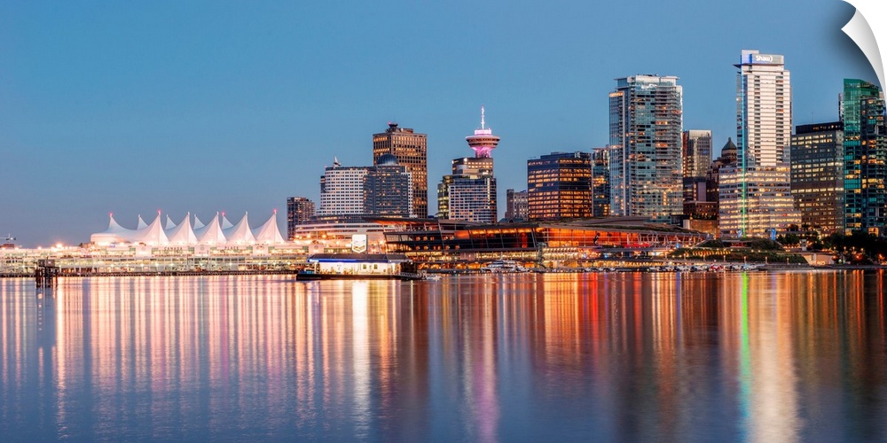 <p>Bright reflections of Vancouver skyline during sunset in British Columbia, Canada.</p>