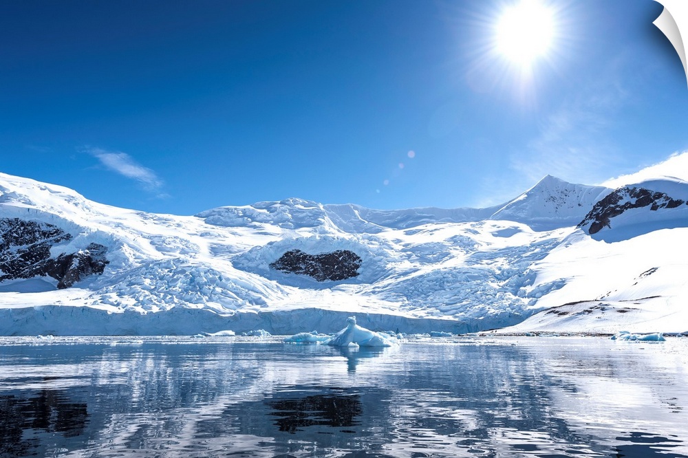 <p>Bright sun and snow on the mountains reflected in the water of Neko Harbor, Antarctica.</p>