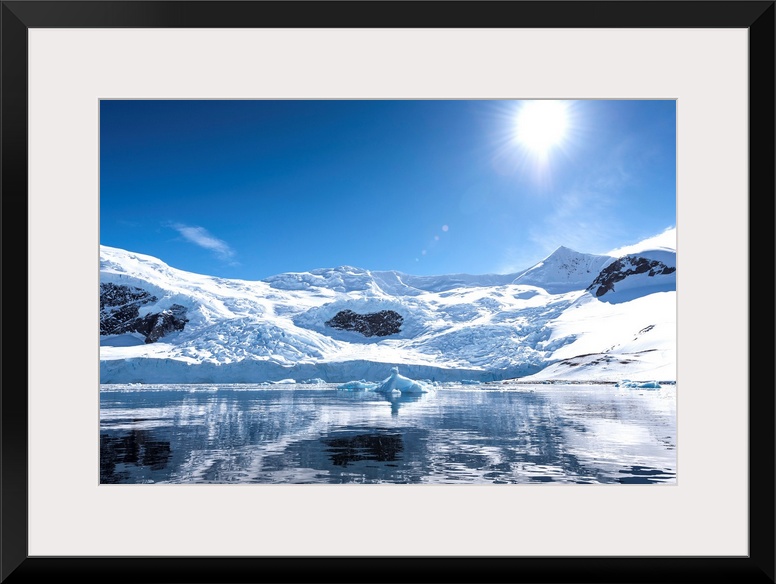<p>Bright sun and snow on the mountains reflected in the water of Neko Harbor, Antarctica.</p>