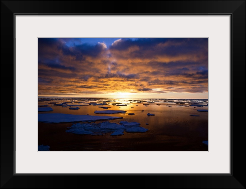 <p>Sunset over pack ice in antarctica, with the bright golden sunlight illuminating the clouds, horizon and reflected on the tranquil water, antarctica.</p>