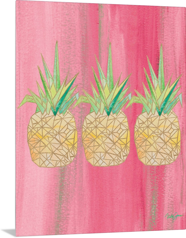 <p>Painting of three pineapples created with metallic gold geometric shapes on a pink background.</p>