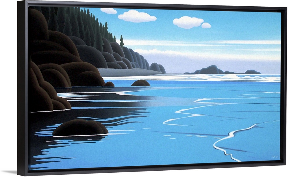 <p>Contemporary colorful painting of a rocky coastline with a forest lining the ridge top.</p>