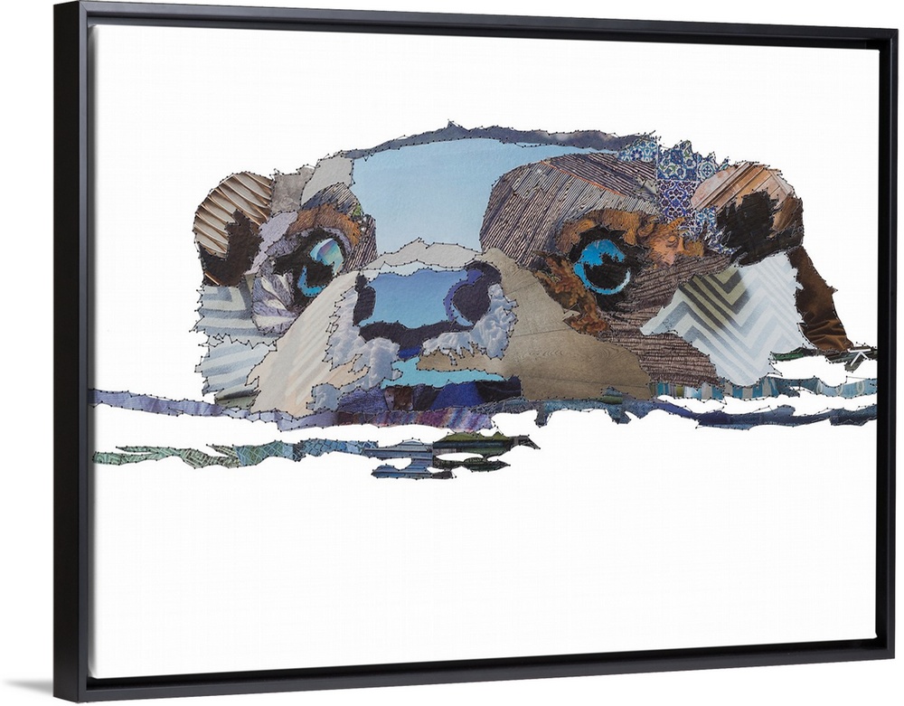 <p>Horizontal artwork of an otter in water in a collage style outlined in stitches.</p>