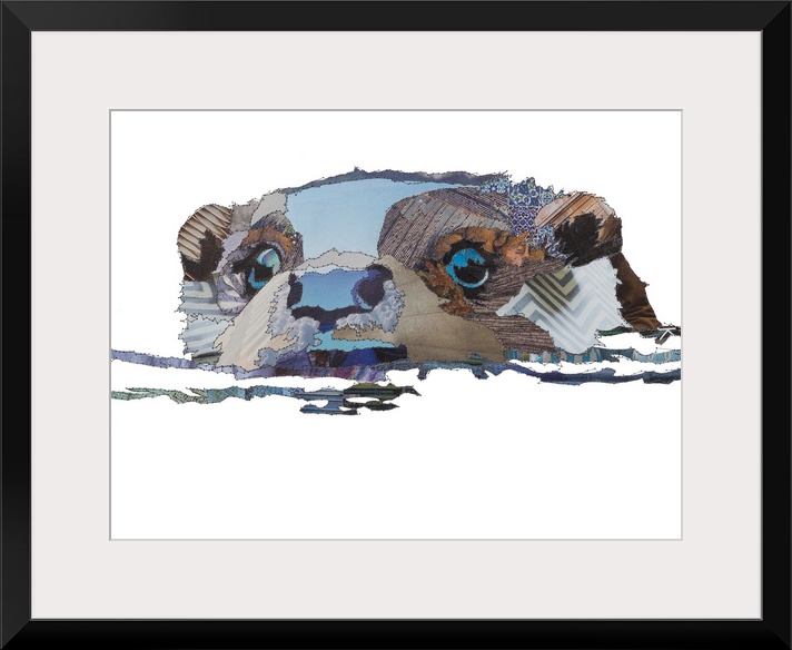 <p>Horizontal artwork of an otter in water in a collage style outlined in stitches.</p>