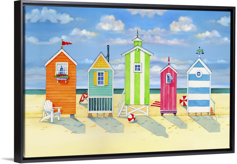<p>Contemporary painting of a row of colorful changing huts on Brighton beach.</p>