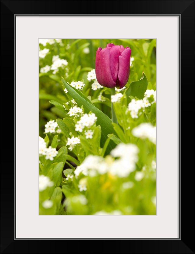 <p>Brilliant colored single tulip contrasts to field of white flowers</p>