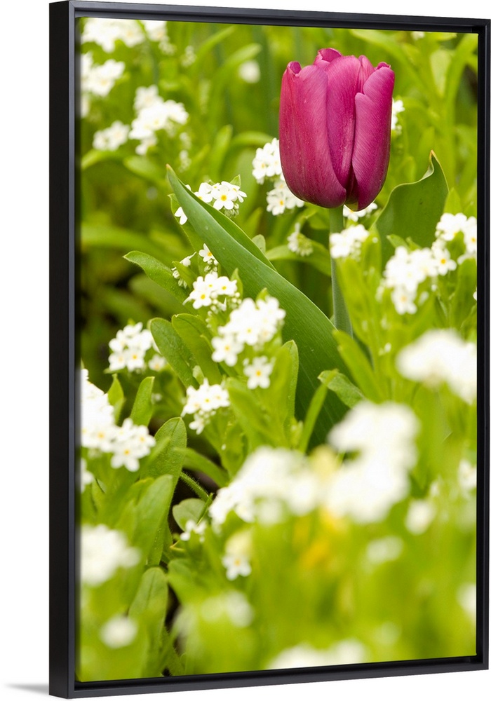 <p>Brilliant colored single tulip contrasts to field of white flowers</p>