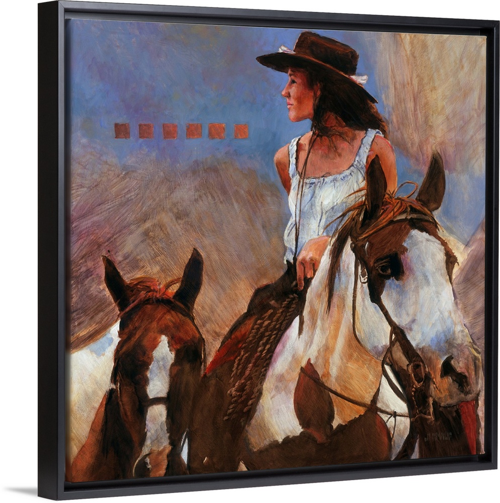 <p>Western themed contemporary painting of a cowgirl on horseback.</p>