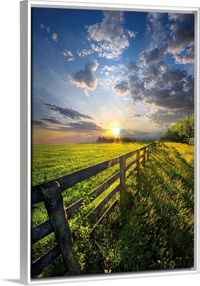 <p>Sunlight and dramatic clouds over a fence in farmland, Wisconsin.</p>