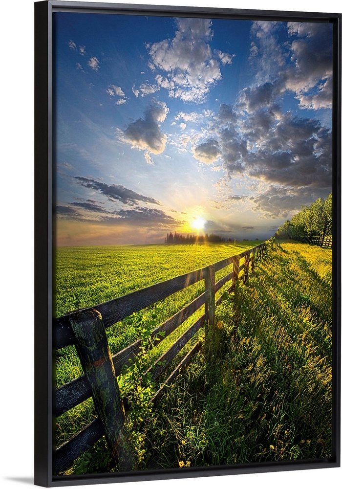 <p>Sunlight and dramatic clouds over a fence in farmland, Wisconsin.</p>