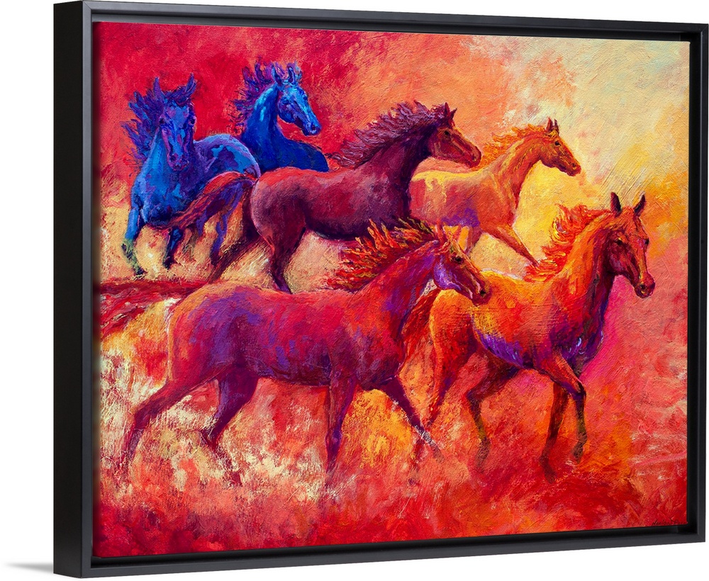 <p>Landscape, large contemporary painting of a group of six horses running together in the same direction. Painted with short, textured brushstrokes in a variety of vibrant colors making the background appear as though it is on fire.</p>