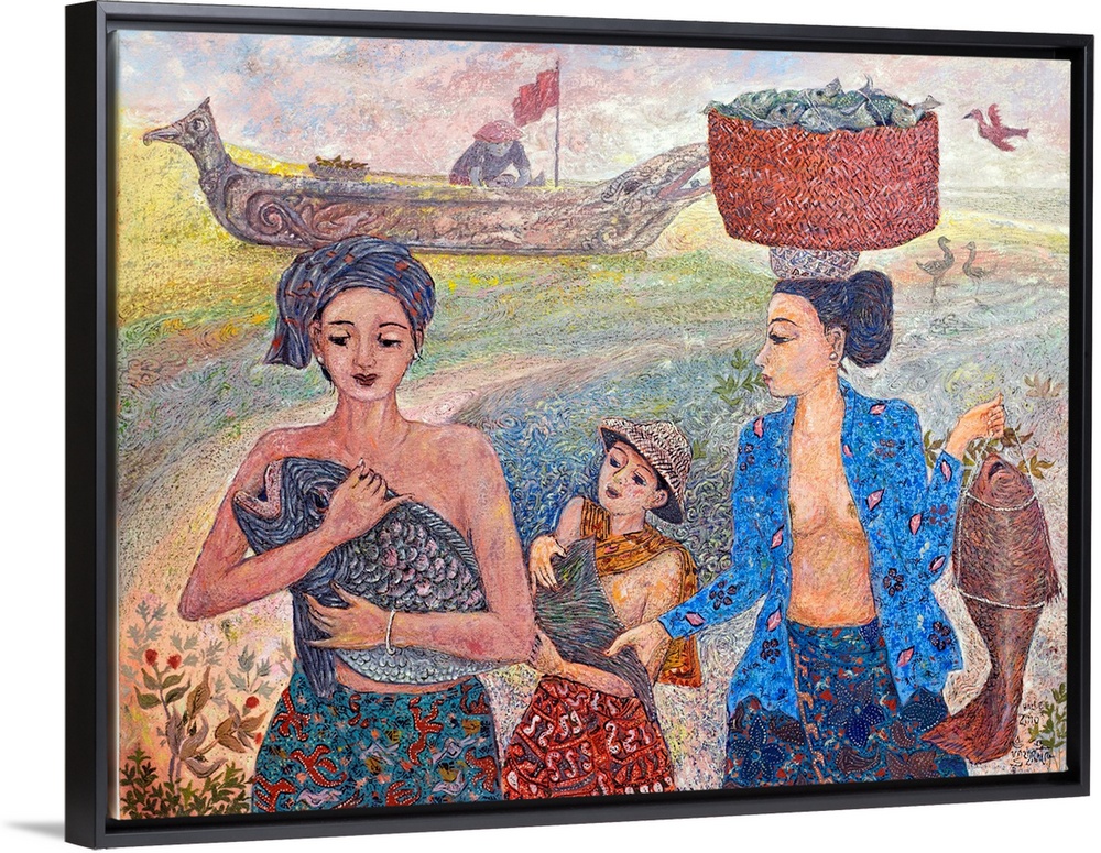 <p>After a day of fishing, a family walks home with the day's catch. Behind them, sea birds soar above a boat on the beach. A women carries a basket brimming with fish on her head while her companion and son embrace a huge grouper. By Made Surita, this beautiful Balinese landscape is filled with sensations of peace and well-being. 'I was inspired by the lesson taught by mothers about helping our parents,' he says. 'This view is commonly seen in traditional Balinese families where a fisherman's sons will pretty much follow their father's vocation.'</p>