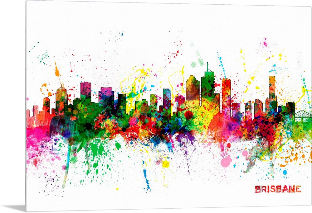 <p>Contemporary piece of artwork of the Brisbane skyline made of colorful paint splashes.</p>