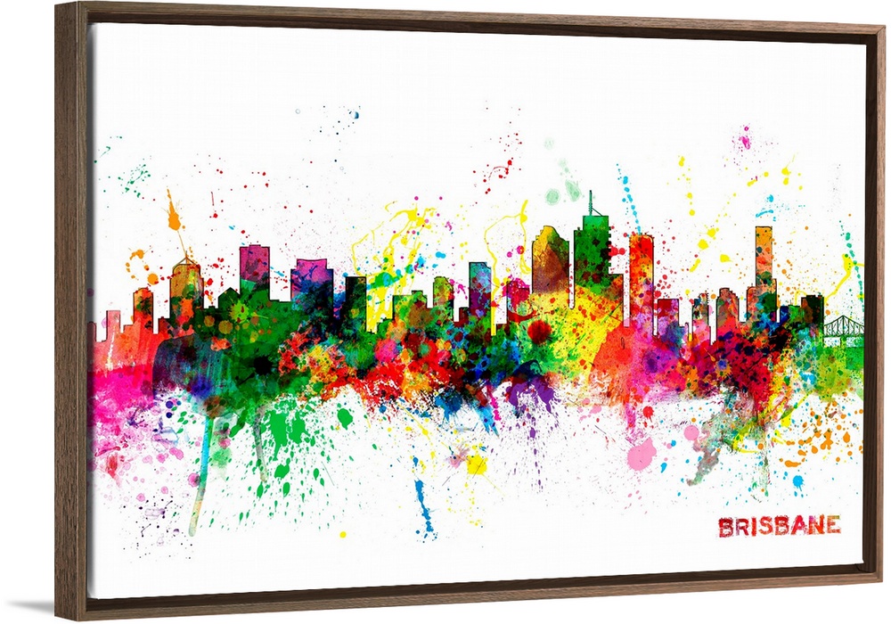 <p>Contemporary piece of artwork of the Brisbane skyline made of colorful paint splashes.</p>