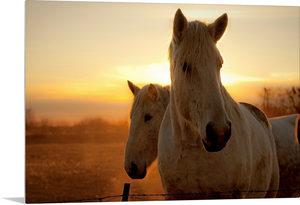 <p>The early dawn light shines behind the manes of two white horses, already moving about their pasture at sunrise.</p>