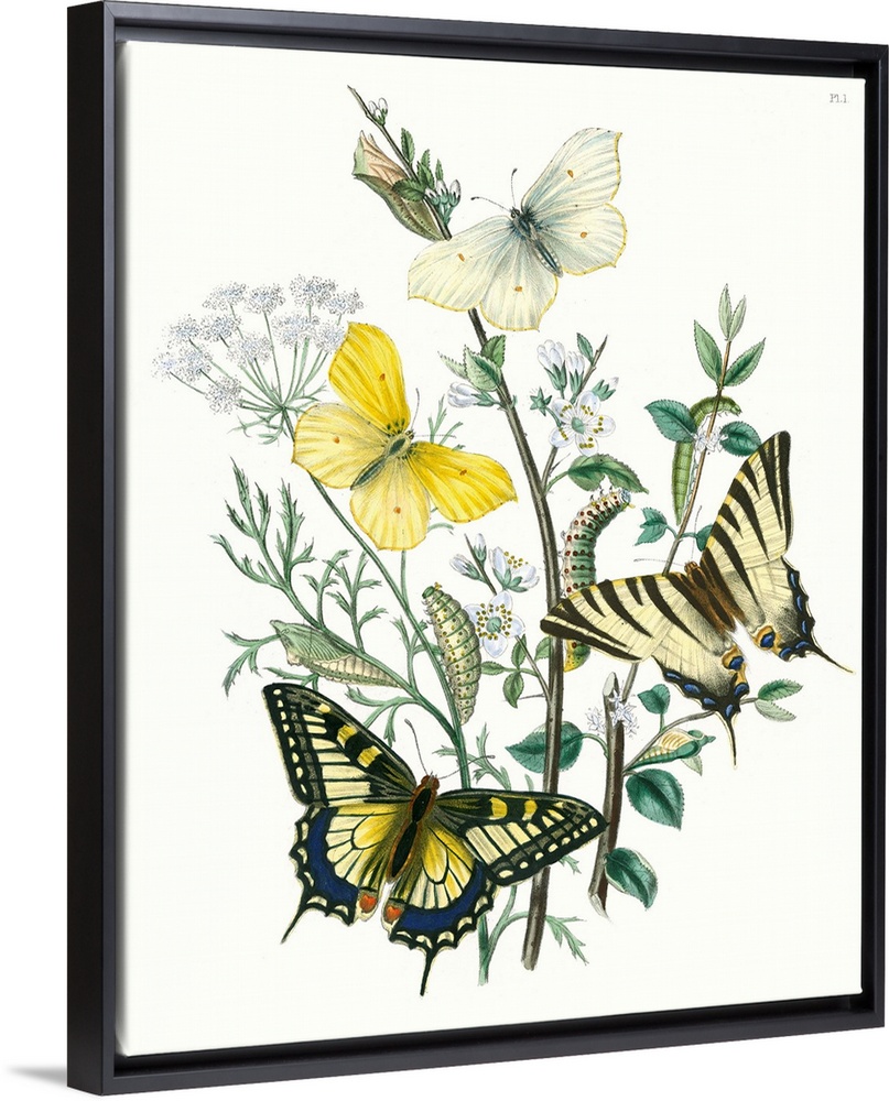 <p>This contemporary illustration created in a vintage style features fluttering butterflies and caterpillars crawling around a flowering plant over a light background with PL.1. in the top right corner.</p>