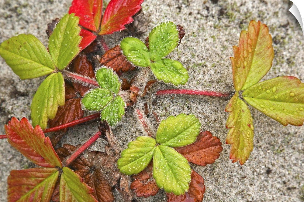 <p>Canada, British Columbia, Calvert Island. Colorful beach strawberry plant growing in sand. Credit as: Don Paulson / Jaynes Gallery / DanitaDelimont.com (RF)</p>
