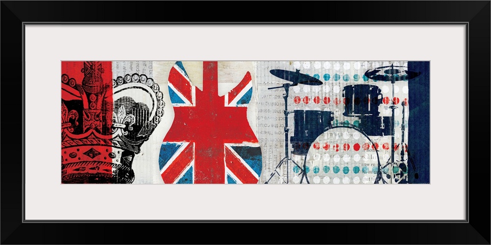 <p>Large, horizontal artwork of collaged British imagery and colors, including an illustrated crown, a guitar with the British flag inside of it and a drum set illustration with a polka dot background.</p>