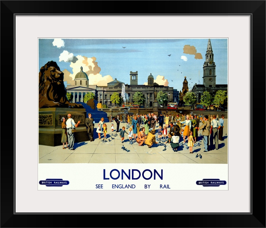 <p>This scene of Londons Trafalgar Square is one of several images that Blake created at this time for the British Railways. A painter in oils and watercolor and a London resident himself, Blake focuses on visitors enjoying the spots twin lion statues and resident pigeons, with the National Gallery and the Church of St. Martin-in-the-Fields in the background. What you cant see may well be the squares most notable landmark; Nelsons Column, erected to the lord admiral after the Battle of Trafalgar. From friendly bobbies to charming children the crowd is well-observed, but the major appeal of this mid-summer cityscape lies in its expert handling of composition.</p>