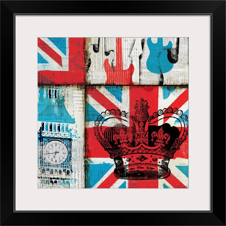 <p>This retro artwork has the United Kingdom flag as the background with Big Ben, guitars and a crown placed over it.</p>