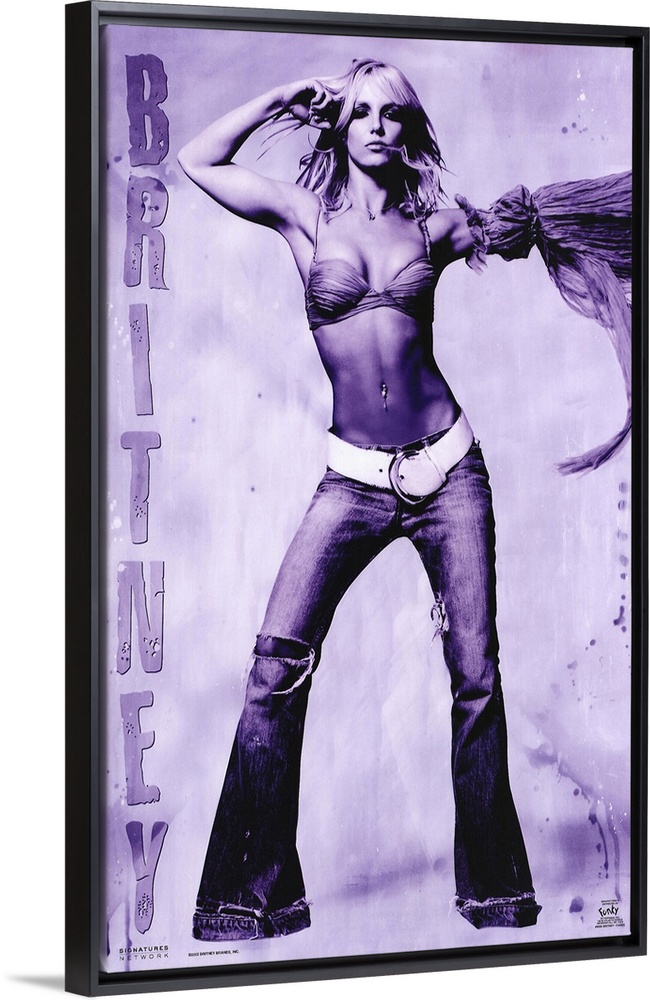 <p>Oversized, vertical music poster on a wall hanging of Britney Spears, standing with arms raised, in tight, bell bottom jeans and a bikini top, her first name extends vertically on her left.</p>
