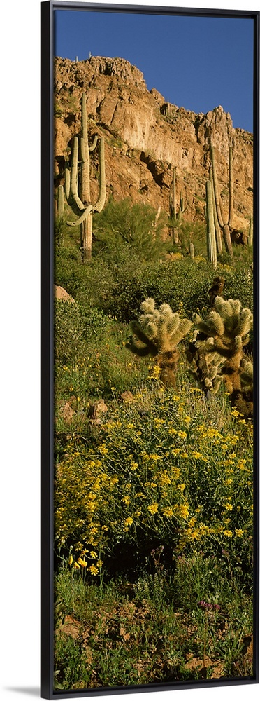 <p>Brittlebushes with mountain in the background, Sonoran Desert, Arizona, USA</p>