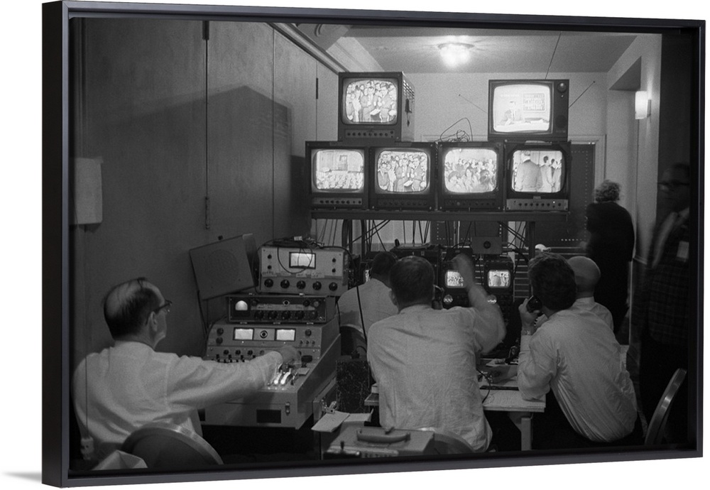 <p>Broadcasting technicians, seated in front of bank of television sets at the Democratic Headquarters. Election Night, November 3, 1964, at the Mayflower Hotel in Washington, D.C.</p>