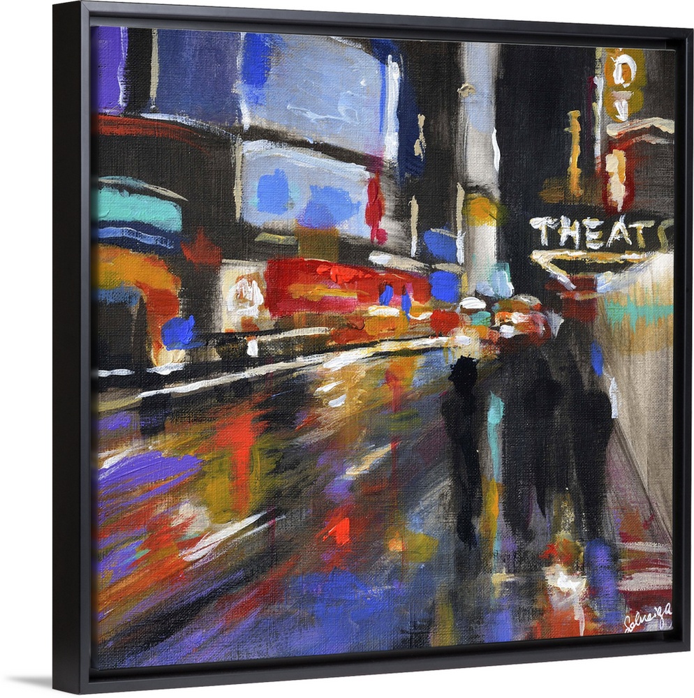<p>Contemporary painting of people walking down a city street in the evening.</p>