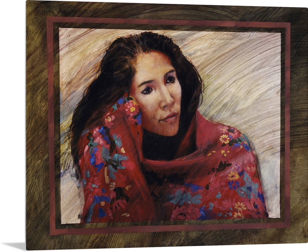 <p>Western themed contemporary painting of a Native American woman wrapped in a blanket.</p>