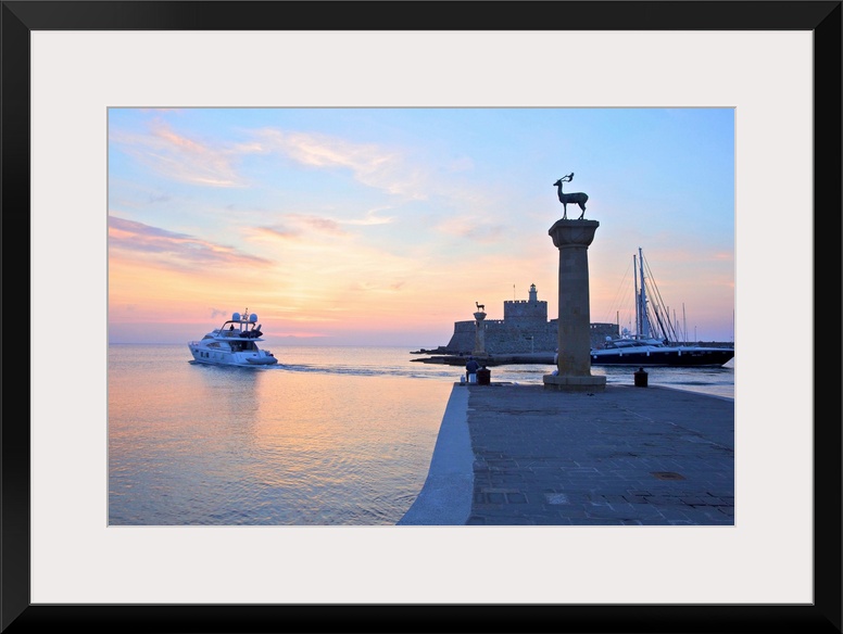 <p>Bronze Doe and Stag Statues At The Entrance Of Mandraki Harbour, Rhodes, Dodecanese, Greek Islands, Greece, Europe.</p>