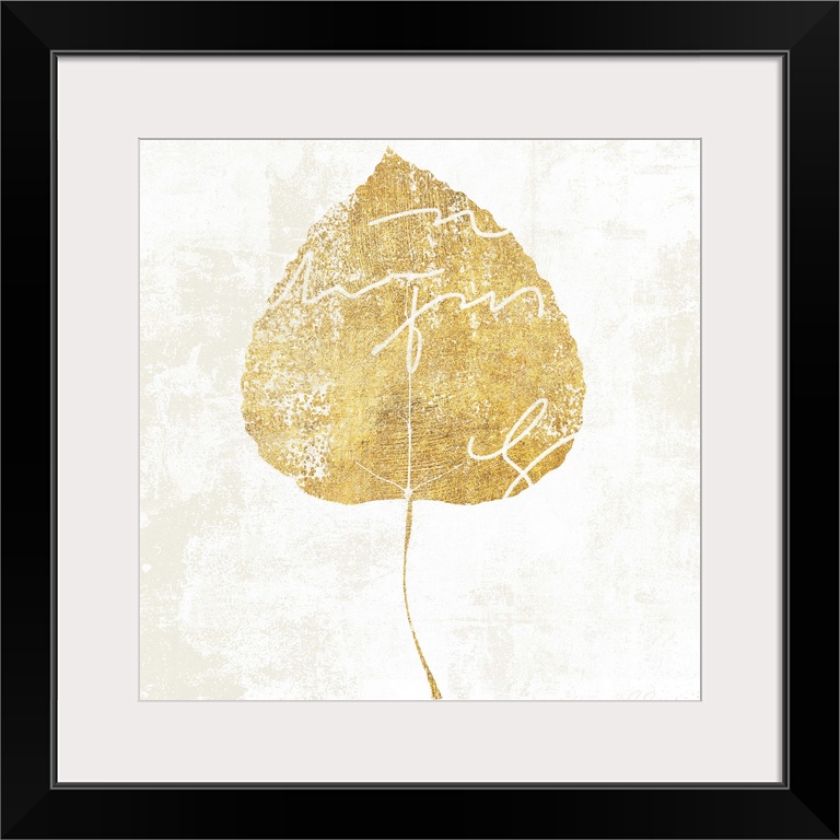 <p>Gold silhouette of a leaf with white writing.</p>