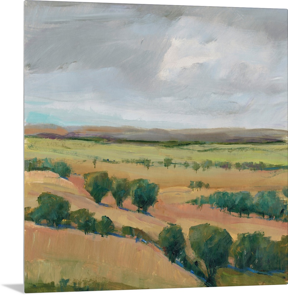 <p>Contemporary landscape painting of hills dotted with trees under a cloudy sky.</p>