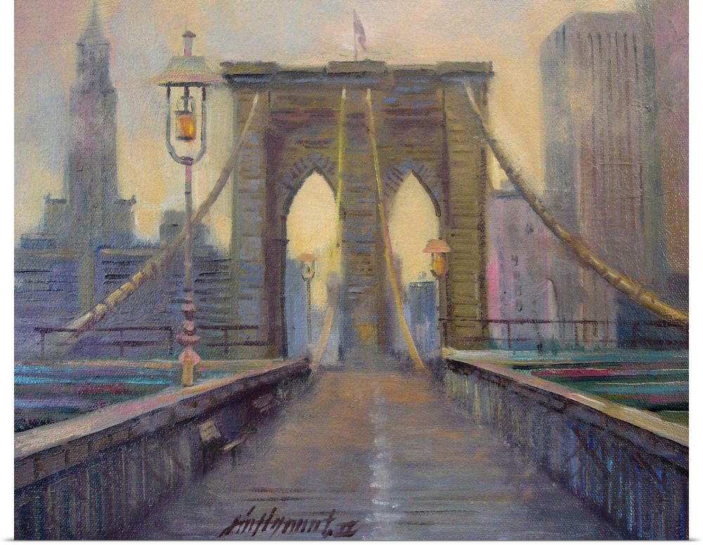<p>Contemporary painting looking straight on at the Brooklyn bridge, with the Manhattan skyline in the background.</p>