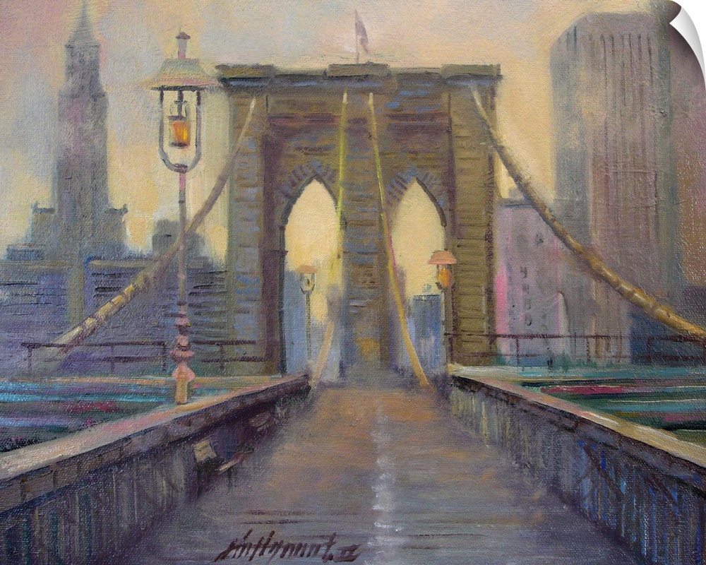 <p>Contemporary painting looking straight on at the Brooklyn bridge, with the Manhattan skyline in the background.</p>