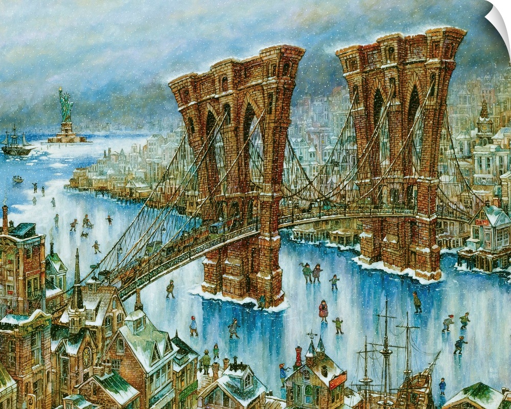 <p>The Brooklyn Bridge in the winter with skaters underneath.</p>