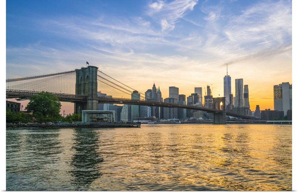 <p>Brooklyn Bridge and Manhattan skyline at dusk, viewed from the East River, New York City</p>