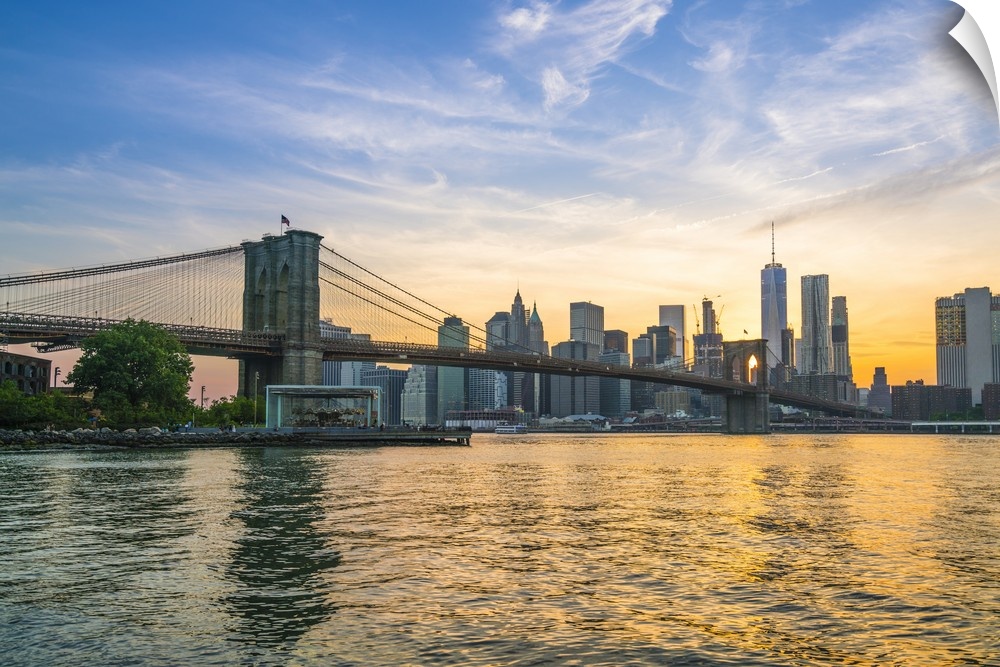 <p>Brooklyn Bridge and Manhattan skyline at dusk, viewed from the East River, New York City</p>