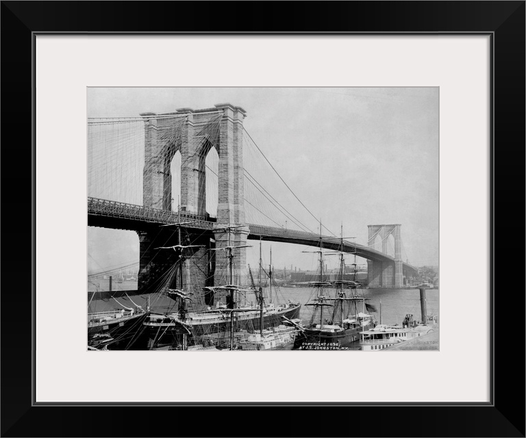 <p>Sailing ships rest in port below the Brooklyn Bridge. The Brooklyn Bridge, designed by John A. Roebling, became the largest suspension bridge in the world when it was completed in 1883. ca. 1895, New York City.</p>