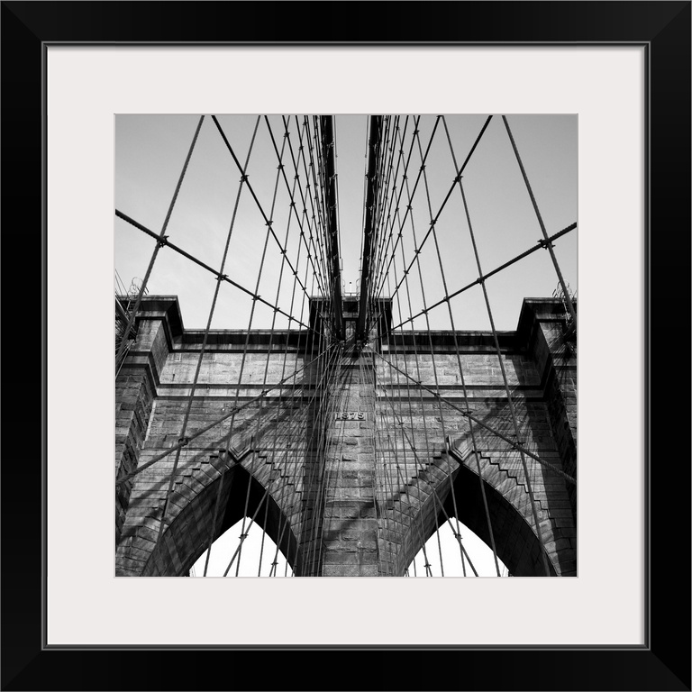 <p>Black and white close up of the Brooklyn Bridge.</p>