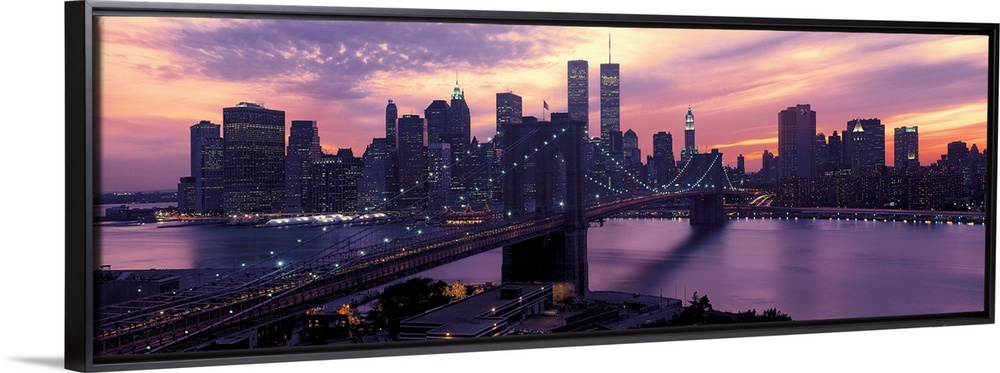 <p>This wall hanging is a panoramic photograph captures the fading sun as skyscrapers begin to turn on their lights for the night.</p>