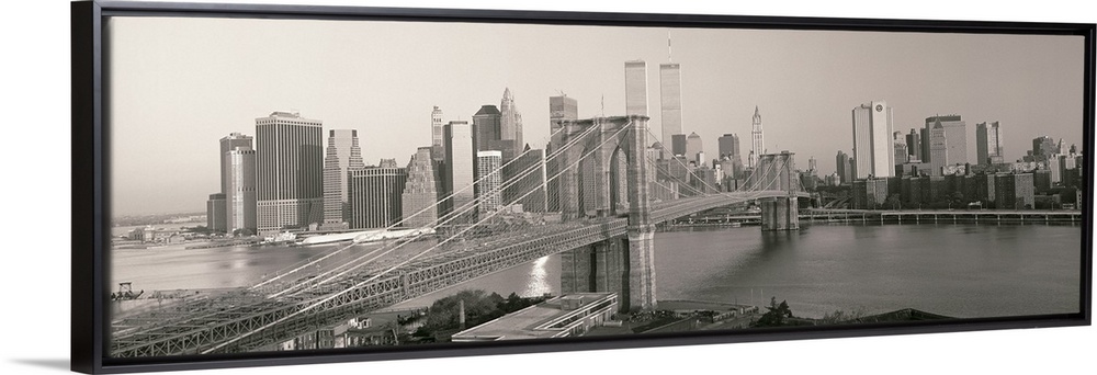 <p>Panorama of Manhattan skyline and the Brooklyn Bridge in black and white and grayscale tones.</p>