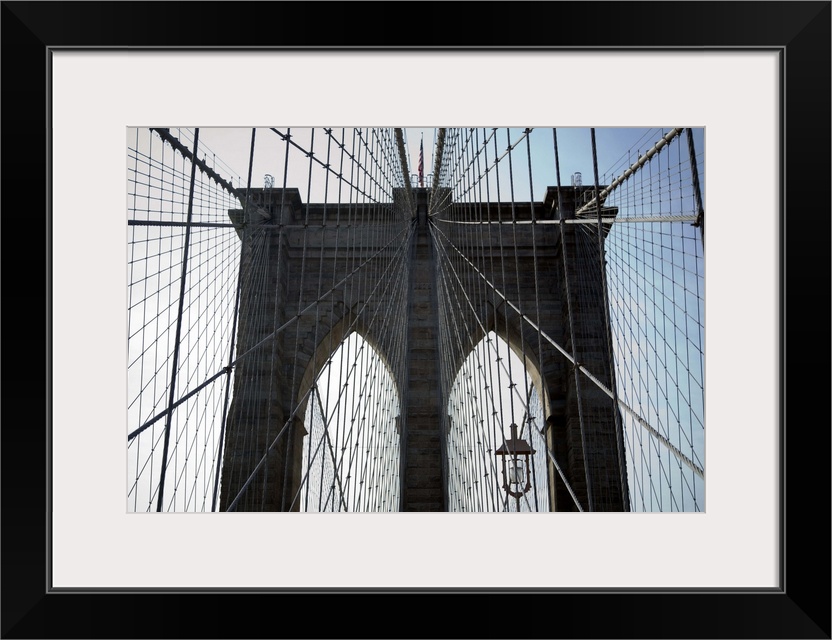 <p>View of one of the towers through criss-crossing cables of the Brooklyn Bridge.</p>