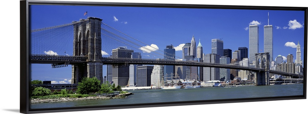 <p>The World Trade Center buildings rise over the city skyline near the large suspension bridge in the famous United States city.</p>