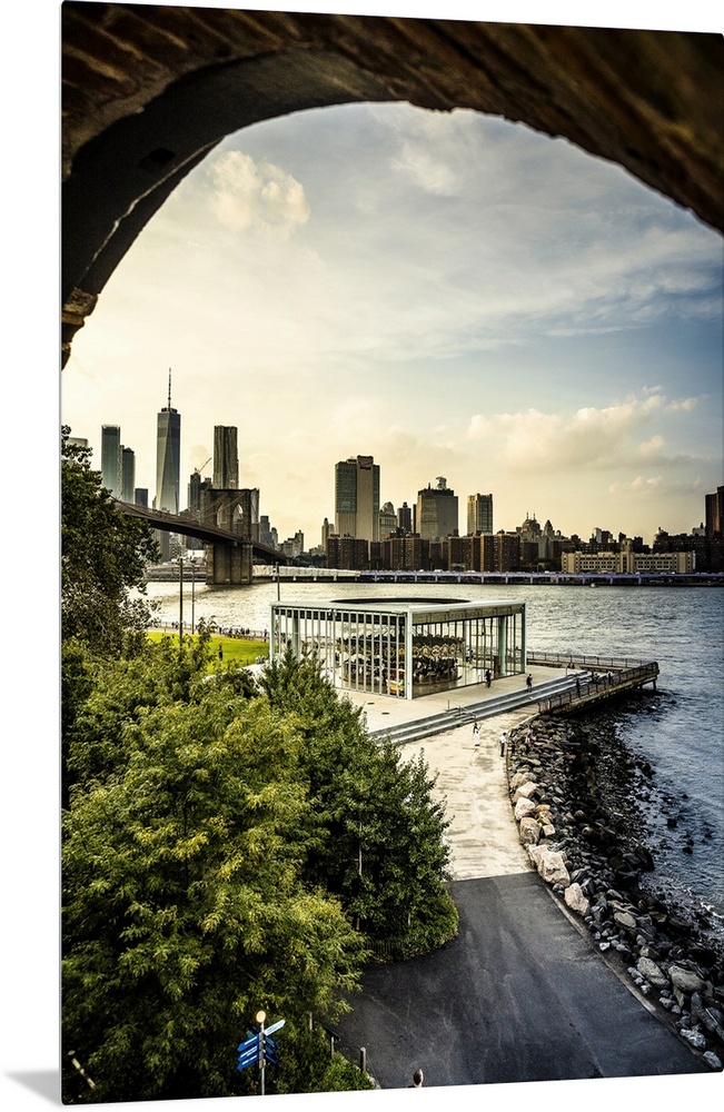 <p>USA, New York City, Brooklyn, Dumbo, Brooklyn Bridge Park, View of Lower Manhattan skyline with the One World Trade Center, Freedom Tower, seen from Dumbo</p>