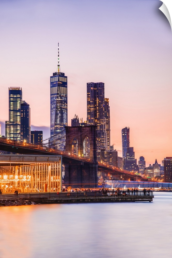 <p>USA, New York City, Brooklyn, Dumbo, Brooklyn Bridge Park, View of Lower Manhattan skyline with the One World Trade Center, Freedom Tower.</p>