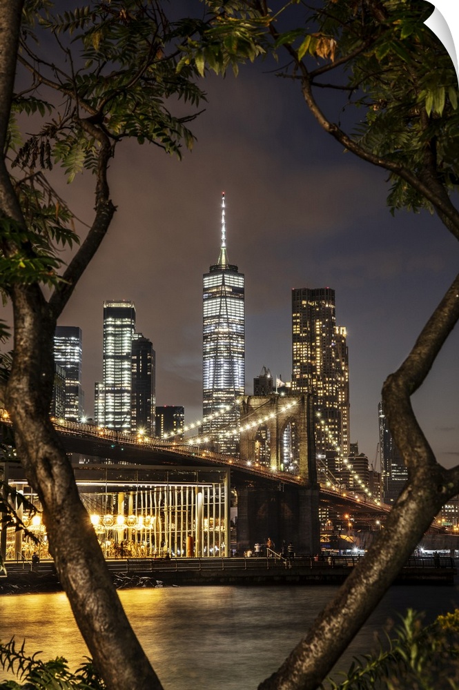 <p>USA, New York City, Brooklyn, Dumbo, Brooklyn Bridge Park, View of Lower Manhattan skyline with the One World Trade Center, Freedom Tower.</p>