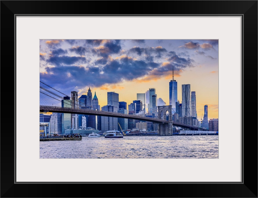 <p>USA, New York City, Brooklyn, Dumbo, Brooklyn Bridge Park, View of Lower Manhattan skyline with the One World Trade Center, Freedom Tower.</p>