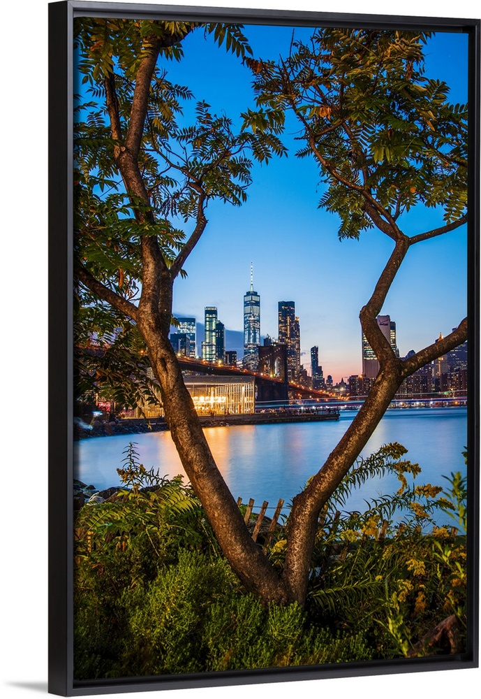 <p>USA, New York City, Brooklyn, Dumbo, Brooklyn Bridge Park, View of Lower Manhattan skyline with the One World Trade Center, Freedom Tower.</p>