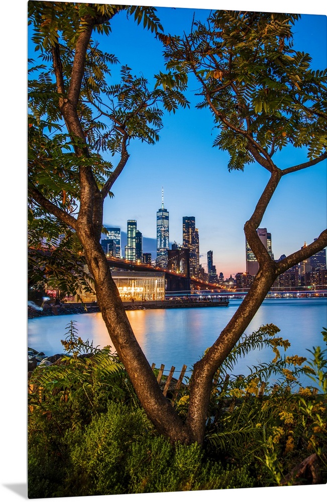 <p>USA, New York City, Brooklyn, Dumbo, Brooklyn Bridge Park, View of Lower Manhattan skyline with the One World Trade Center, Freedom Tower.</p>